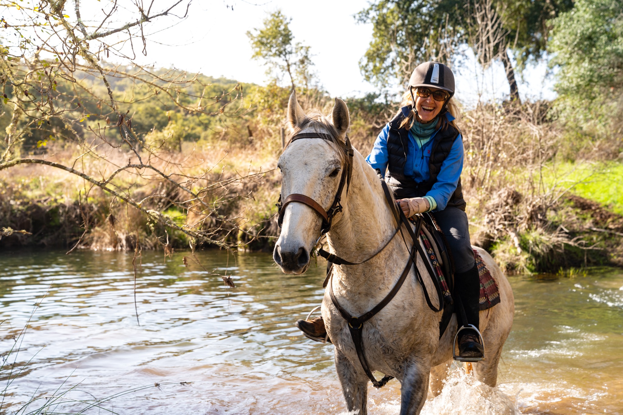 ‘The Lusitano horses are well-trained and had comfortable gaits for long rides. I rode Cujo, and he was terrific, uncomplicated and gave me a dream ride. Our guides were most accommodating and provided us with local history and culture. The food was amazing with fresh fish and grilled meat daily. Accommodations were comfortable with lovely pools to swim in after the ride. The wine flowed freely, and the riders enjoyed swapping stories about their equestrian experiences. My fellow riders were all evenly matched in riding ability, so it was a joy to ride daily!’