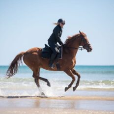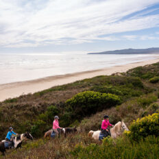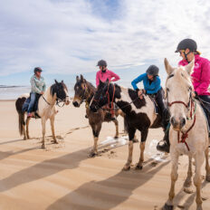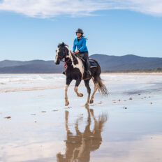 ‘I loved everything about the Cradle to Coast ride: the horses, the food, the views, the guides, and the group I rode with. We stayed at Bakers Beach in beautiful and comfortable accommodation. What a view! Everyone loved the sauna and hot or cold baths. I rode Chockie, a lovely, quiet gelding who was fabulous with his slightly nervous rider aboard. The guides were wonderful, so friendly and helpful. The beach ride was one of my best rides ever! An unforgettable experience, and one I’d love to do again soon.’