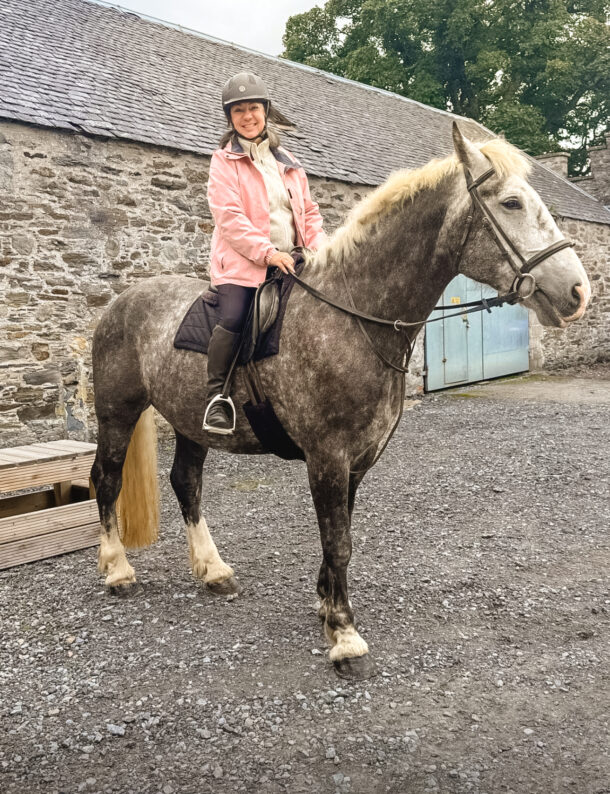 ‘This was my first ride with Globetrotting, and it was amazing! I was a little nervous—both about going solo and the riding—but everyone was so friendly, and our host, Jess, did a fantastic job of facilitating the group. It only took one canter across the Scottish countryside on my steady partner for the week, Quinston, for me to feel completely comfortable and absolutely thrilled! Every picture I sent to friends and family received comments on how happy I looked. Beyond the riding, Tulliemet House and the hospitality were incredible. I can’t remember the last time I felt so relaxed or ate so well. Come for the riding; stay for Rebecca’s onion-cheddar tart, cold plunges in the loch after a sauna, and the wonderful Scottish hospitality. (Could I have afternoon tea every day?) The trip was so incredible that I immediately started planning my next one!’